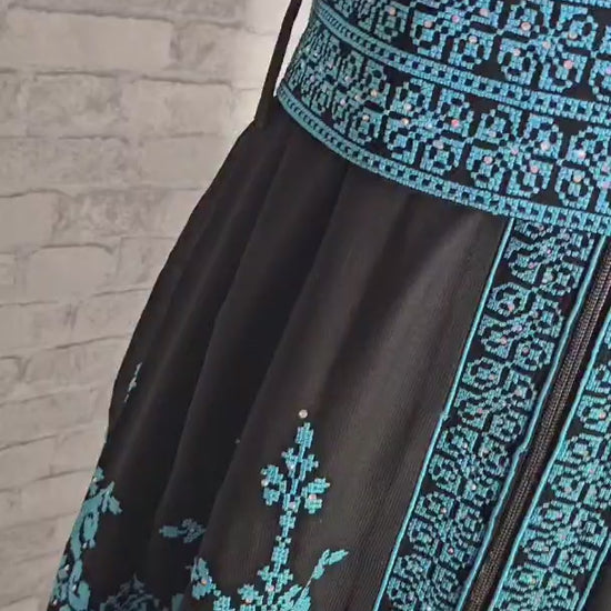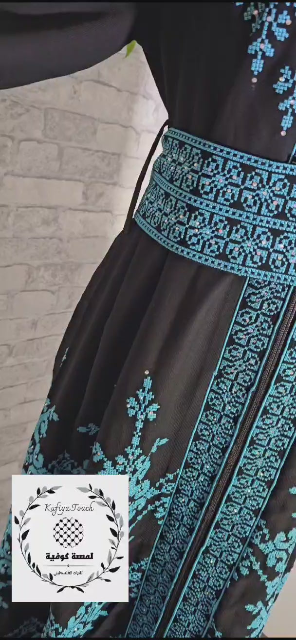 Voeg een vleugje traditionele elegantie toe aan je garderobe met deze schitterende Palestijnse jurk. De jurk is vervaardigd uit hoogwaardige stof en versierd met een gedetailleerde borduurwerkprint in koningsblauw op een diepe zwarte basis. De bijpassende riem zorgt voor een elegante, getailleerde look, terwijl de lange mouwen en opstaande kraag een klassieke uitstraling geven.