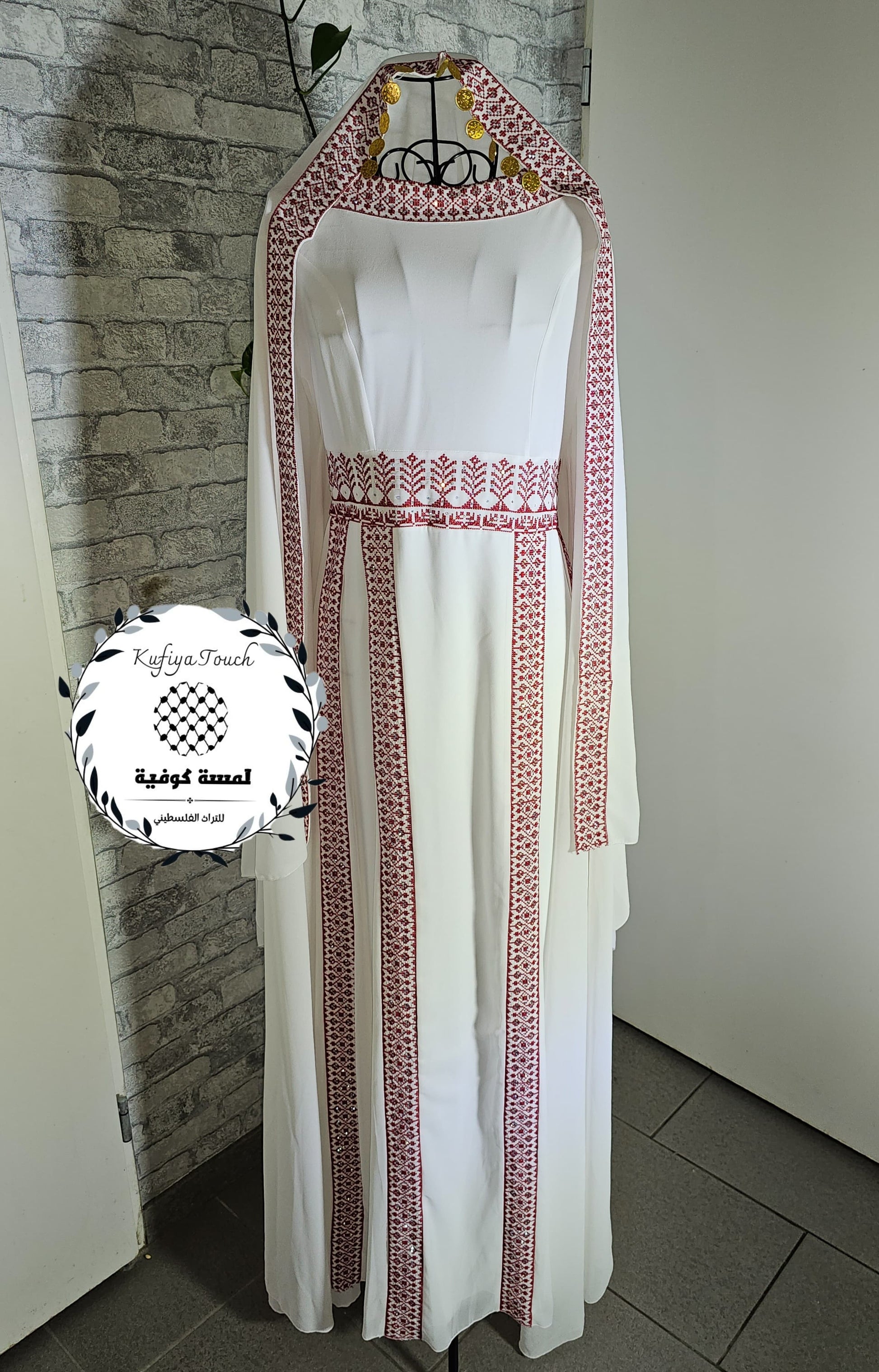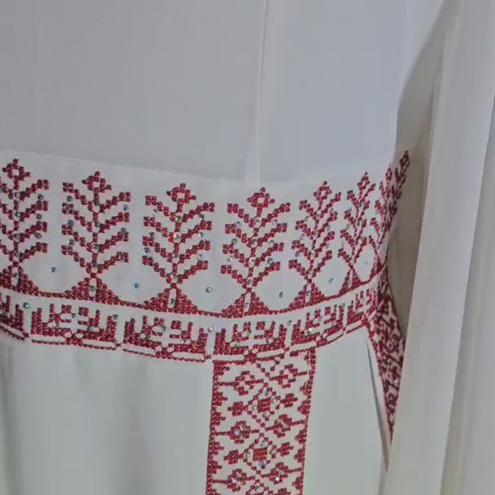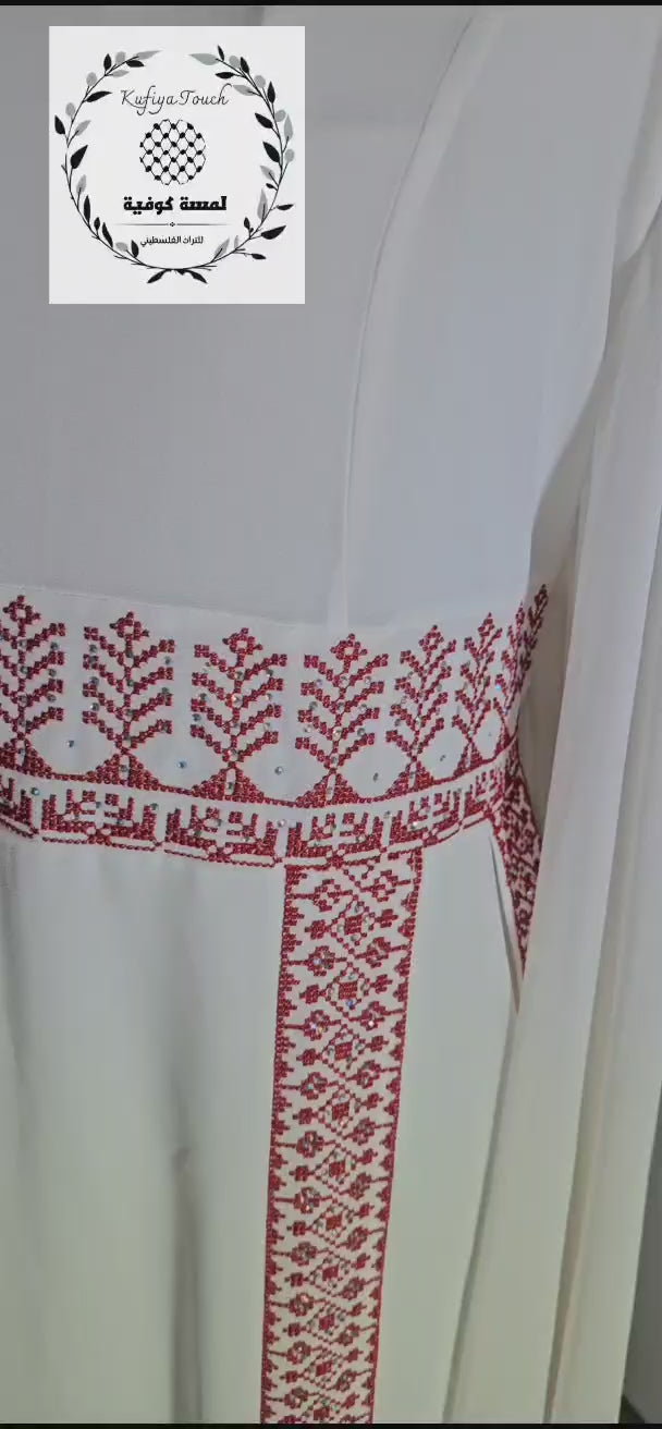 Ervaar de elegantie en culturele rijkdom van deze prachtige Palestijnse thobe. Dit lange, witte gewaad is versierd met traditionele rood-zwarte borduurmotieven die geïnspireerd zijn op de iconische Palestijnse kufiya. De gedetailleerde patronen op de mouwen, taille en rok geven deze jurk een authentieke en verfijnde uitstraling.