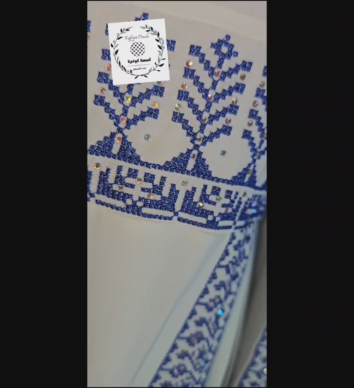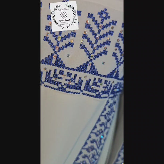 Deze elegante Palestijnse jurk combineert traditionele patronen met moderne elegantie. De witte stof is versierd met prachtig blauw borduurwerkprint, wat zorgt voor een verfijnde en stijlvolle uitstraling. De jurk heeft een comfortabele, vloeiende pasvorm en lange mouwen, perfect voor elke gelegenheid.